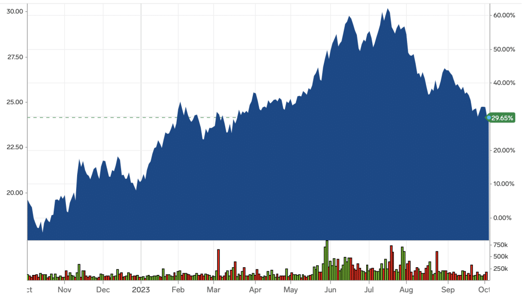 Der ETF hat eine YTD-Rendite von 14,70% (Stand Okt. 2023) und eine Rendite von 9,66% für das Jahr 2021 und -40,45% im Jahr 2022.