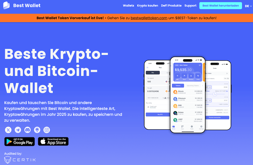 Um den Bitcoin Hyper Coin kaufen zu können, müssen Sie eine eigene Wallet besitzen. Wir raten Ihnen dazu, unseren Testsieger, die Best Wallet, zu benutzen. Sie bietet aktuell die einfachste Lösung an, um in neue und innovative Projekte zu investieren. Die Anwendung kann auf Mobilgeräten mit Android oder iOS installiert werden und wird in den jeweiligen App-Shops zum Download angeboten. Mit nur einem Klick können Sie sie auf dem gewünschten Mobilgerät einrichten.