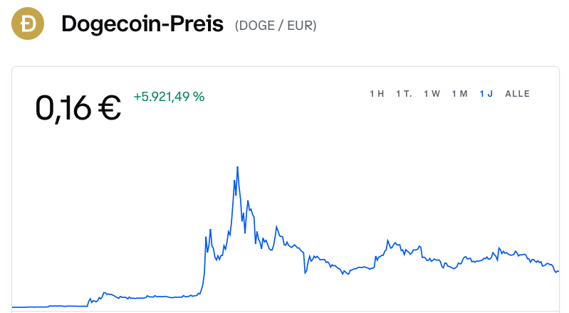 Aktuell steht der Doge am 05.11.2021 bei 0,225 Euro. Doge ist von einer hohen Volatilität geprägt. Mit dem Doge ließen sich dieses Jahr enorme Gewinne einfahren. Wer zur richtigen Zeit investiert hatte, konnte einen 100-Bagger erlangen. Wer am Alltime-High kaufte, hat bis heute jedoch mehr als 50 % des eingesetzten Kapitals verloren. Ein Investment in Kryptowährungen bringt enorme Chancen, aber auch große Risiken mit sich. Bei einer so hohen Volatilität einer Währung, ist es sehr schwierig, eine Prognose für die Zukunft abzugeben.